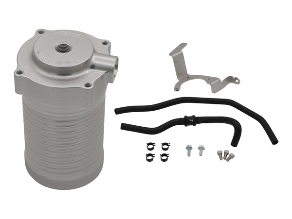 Each PRL Helix AOS is designed and produced in house using CNC machined 6061-T6 billet aluminum and finished with a durable hard anodized coating. The canister is available in both Black and Silver anodized finishes and is paired with a laser cut and CNC bent 304 stainless steel mounting bracket. Custom molded reinforced rubber hoses, billet aluminum fittings, a billet check valve, and Viton O-rings are used throughout the system to ensure long term durability, chemical resistance, and a clean OEM style installation.